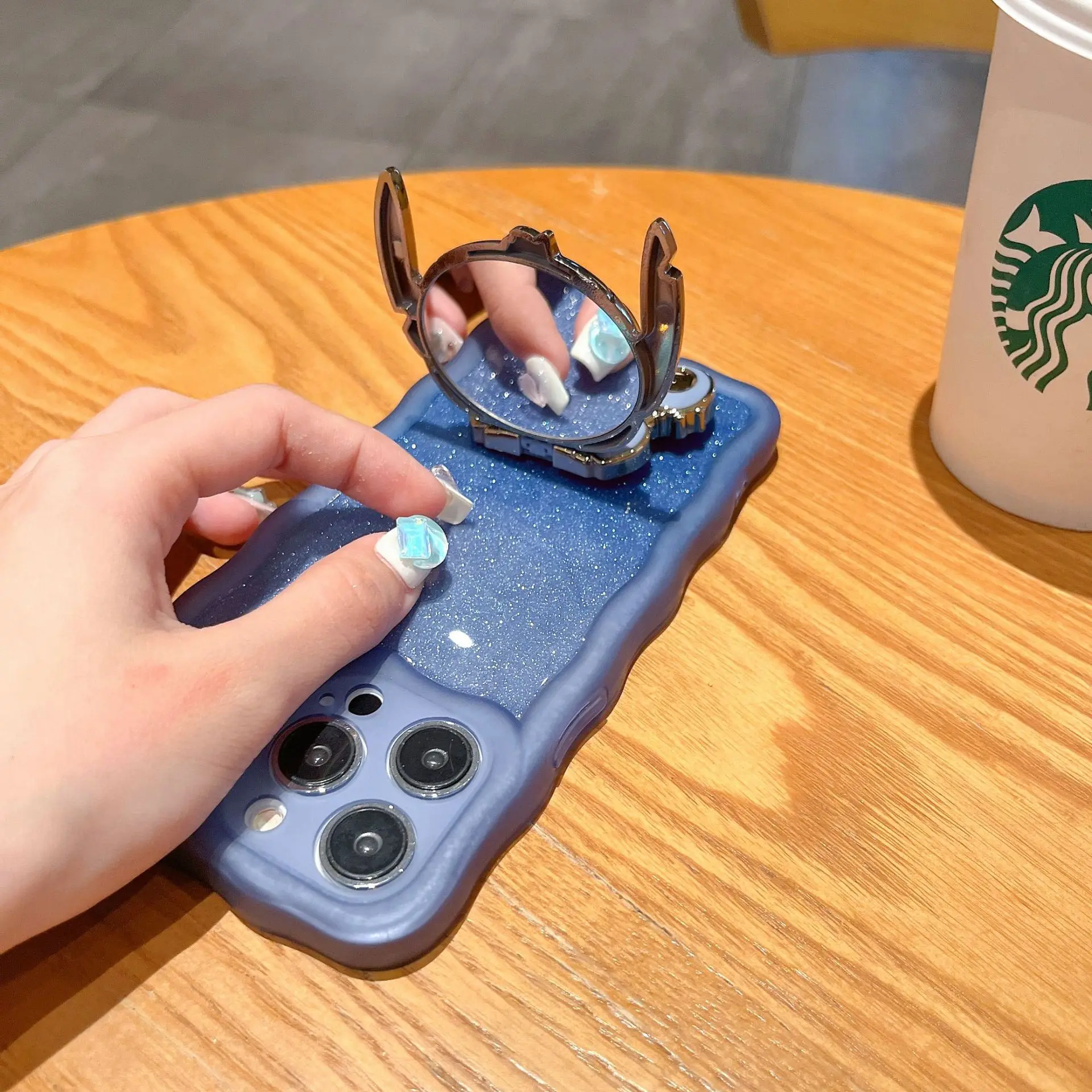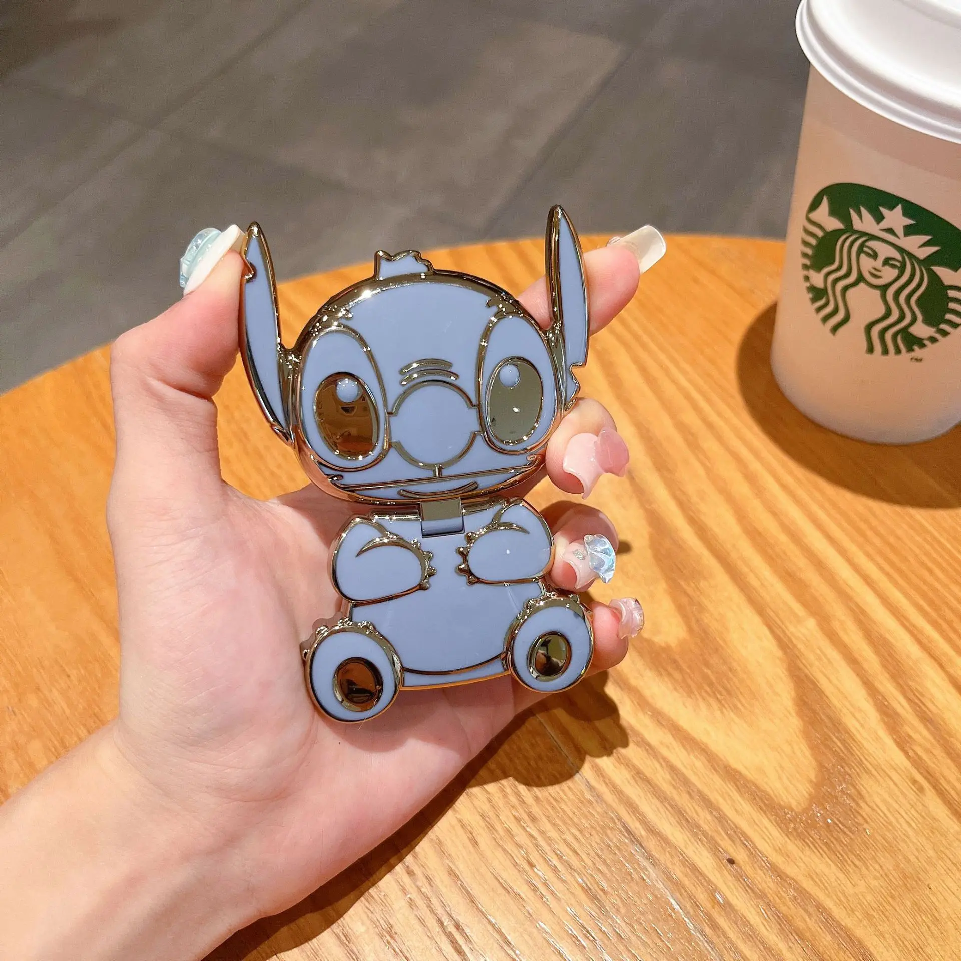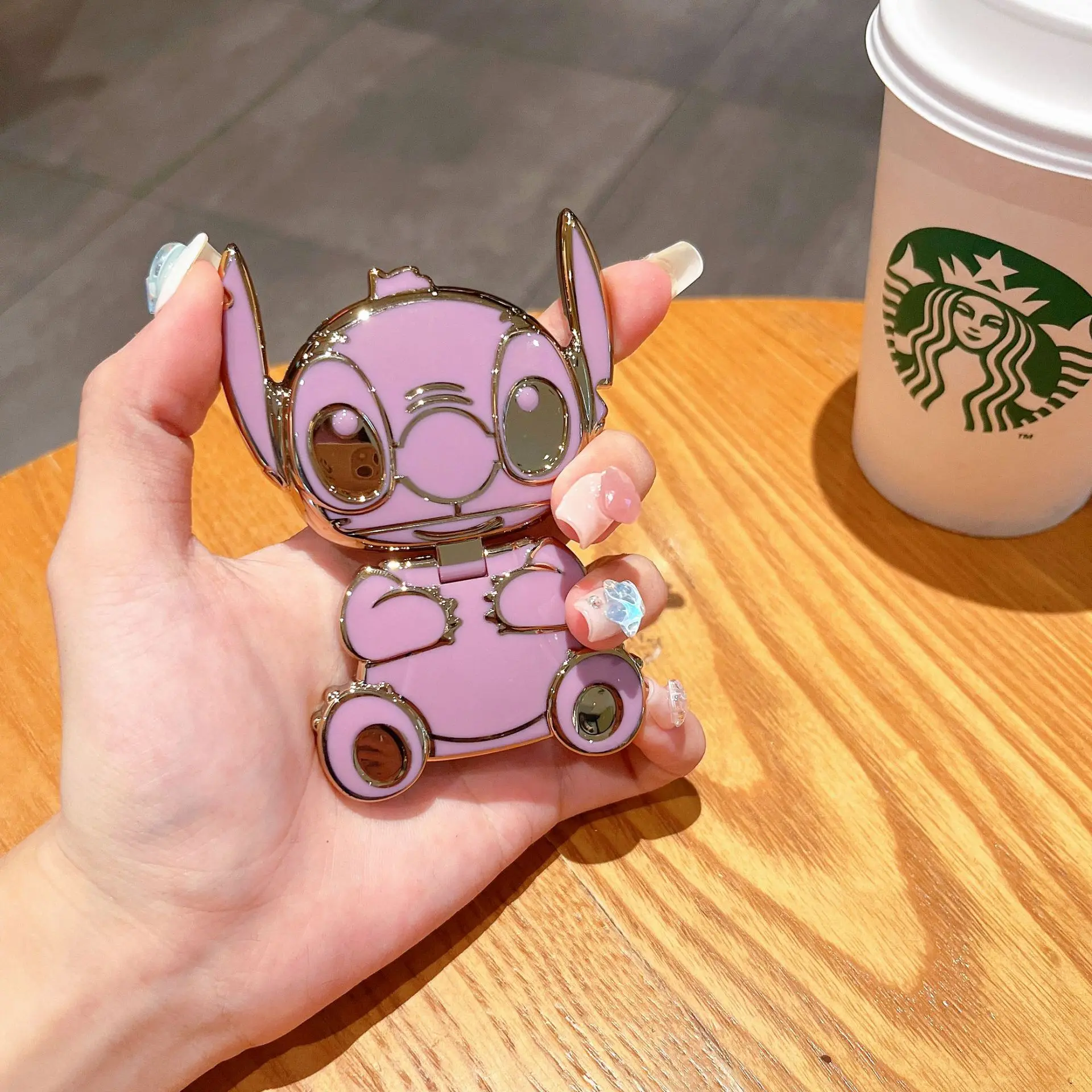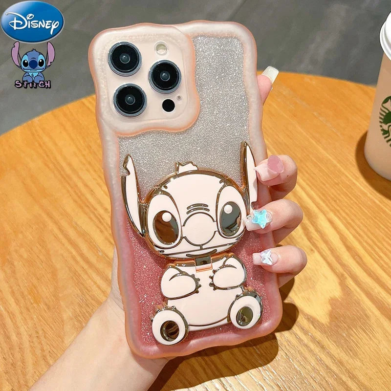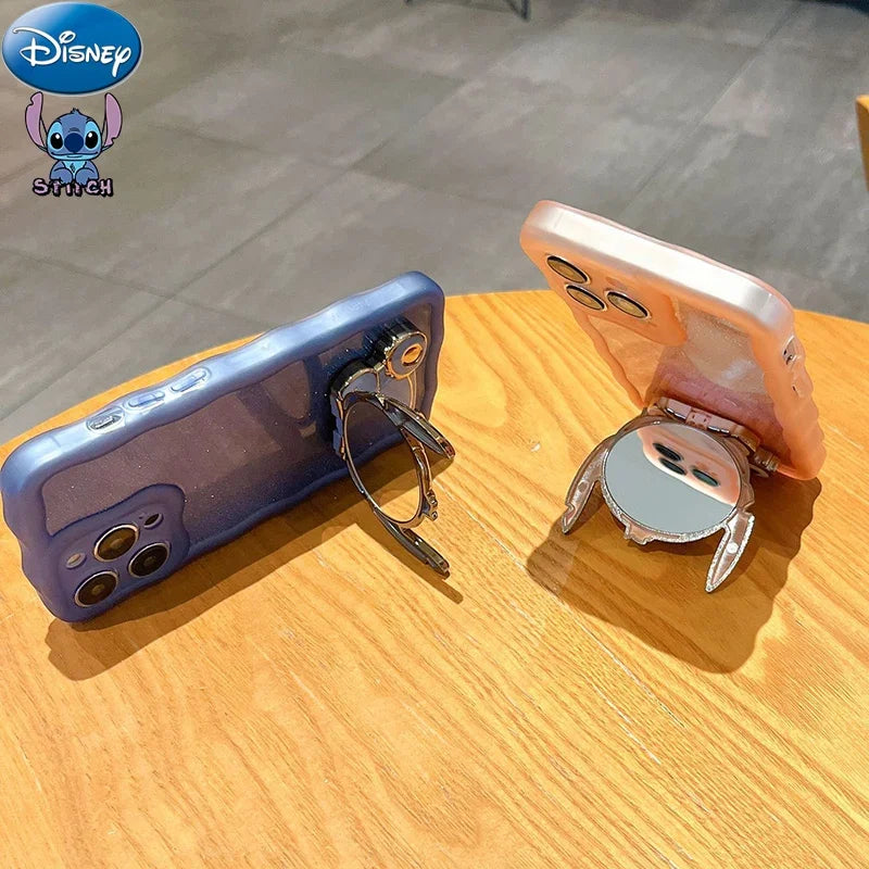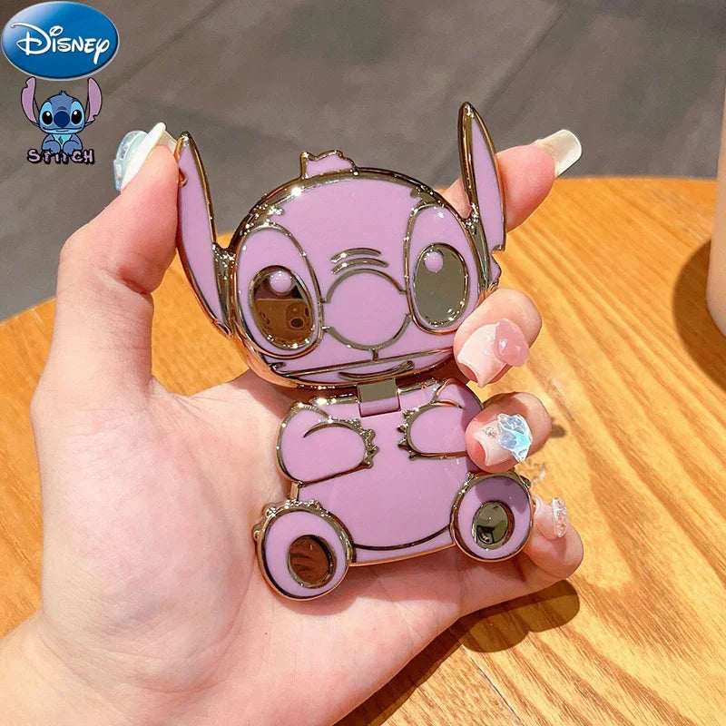 Este soporte de teléfono kawaii con diseño de Lilo & Stitch incluye un espejo integrado, funciona como soporte universal y también como adorno trasero tipo sticker.